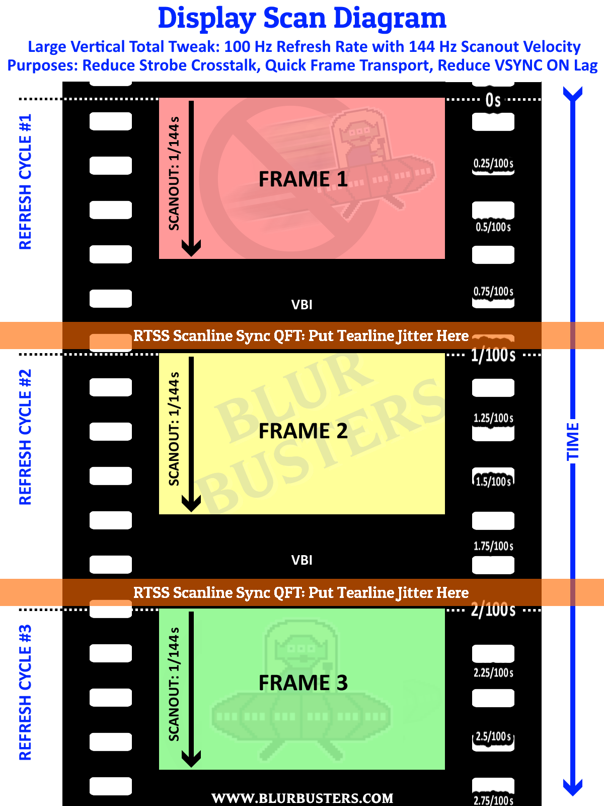 In this use case, the bigger the Vertical Total, the more room in the VBI to hide tearline jitter using scanline-based frame rate capping techniques. RTSS Scanline Sync steers to raster-precise VSYNC OFF in the blanking interval between refresh cycles, moving the tearlines off the top edge of the screen.